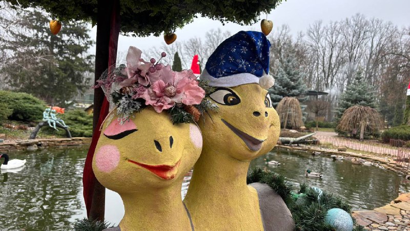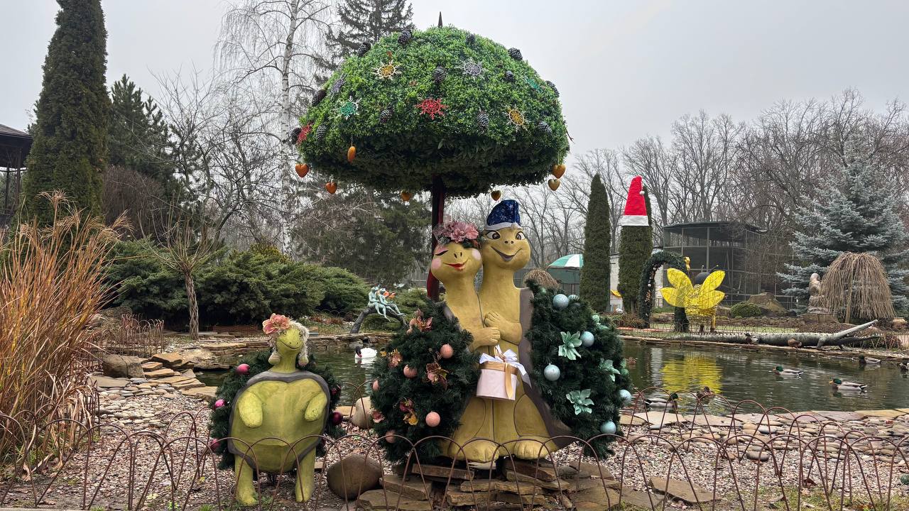 Біля водойми живе черепашача родина, яка цього року стала однією з найзатишніших зимових локацій. Святкові вінки та декоративна «парасолька» створюють теплий, казковий настрій — чудове місце для сімейних фото.